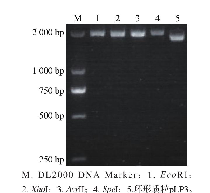 电泳结果显示植物乳杆菌LP3的质粒提取液有3 条带(图1),提示该菌株携带多个质粒。其中一个质粒大小在2 kb左右,另外2 个质粒大小在15 kb以上。将小质粒(2 kb左右)进行纯化回收,并命名为pLP3。对pLP3质粒分别采用限制性内切酶EcoRI、XhoI、AvrII、SpeI进行酶切分析,最终发现该质粒经EcoRI、XhoI、AvrII、SpeI酶切均获得线性化质粒,而且是唯一的线状质粒DNA条带,不存在其他大小的DNA条带(图2)。