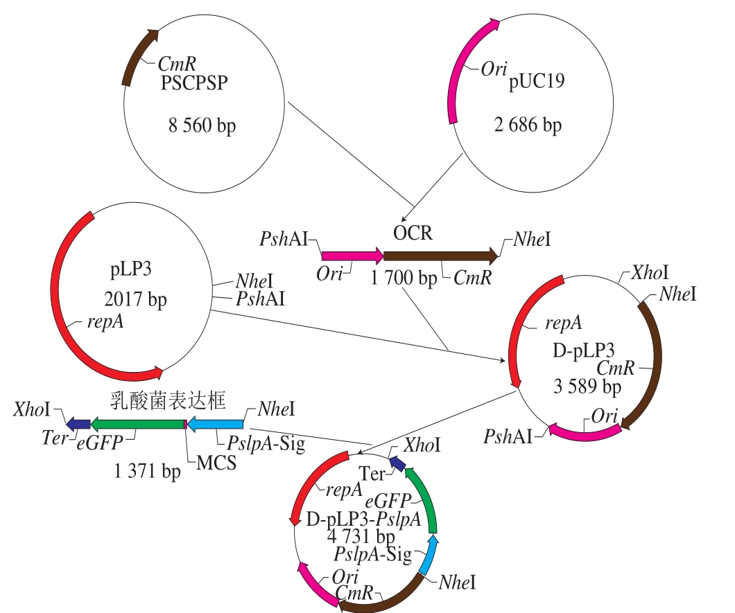 以克隆载体pUC19为模板,用引物pUC19-F/R扩增pUC19质粒上的大肠杆菌复制子Ori的DNA片段。以pSCPSP质粒为模板,用引物CmR-F/R扩增pSCPSP质粒上的氯霉素抗性基因CmR片段。用SOE-PCR将Ori片段与CmR片段连接构成OCR片段,利用PshAI、NheI两个限制性内切酶将OCR片段融合在pLP3质粒载体上,将重组质粒转化至大肠杆菌DH5α感受态细胞,挑取转化子酶切验证得到正确的重组质粒,命名为D-pLP3。